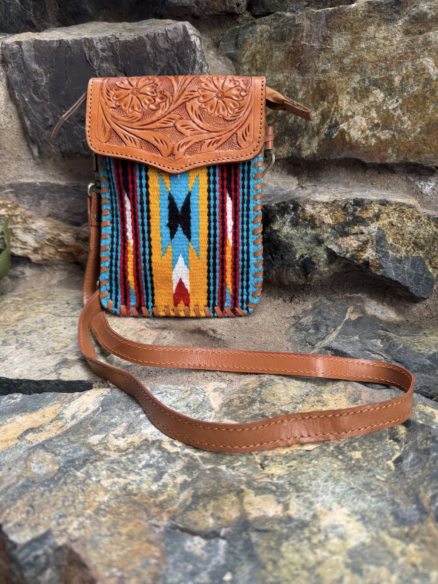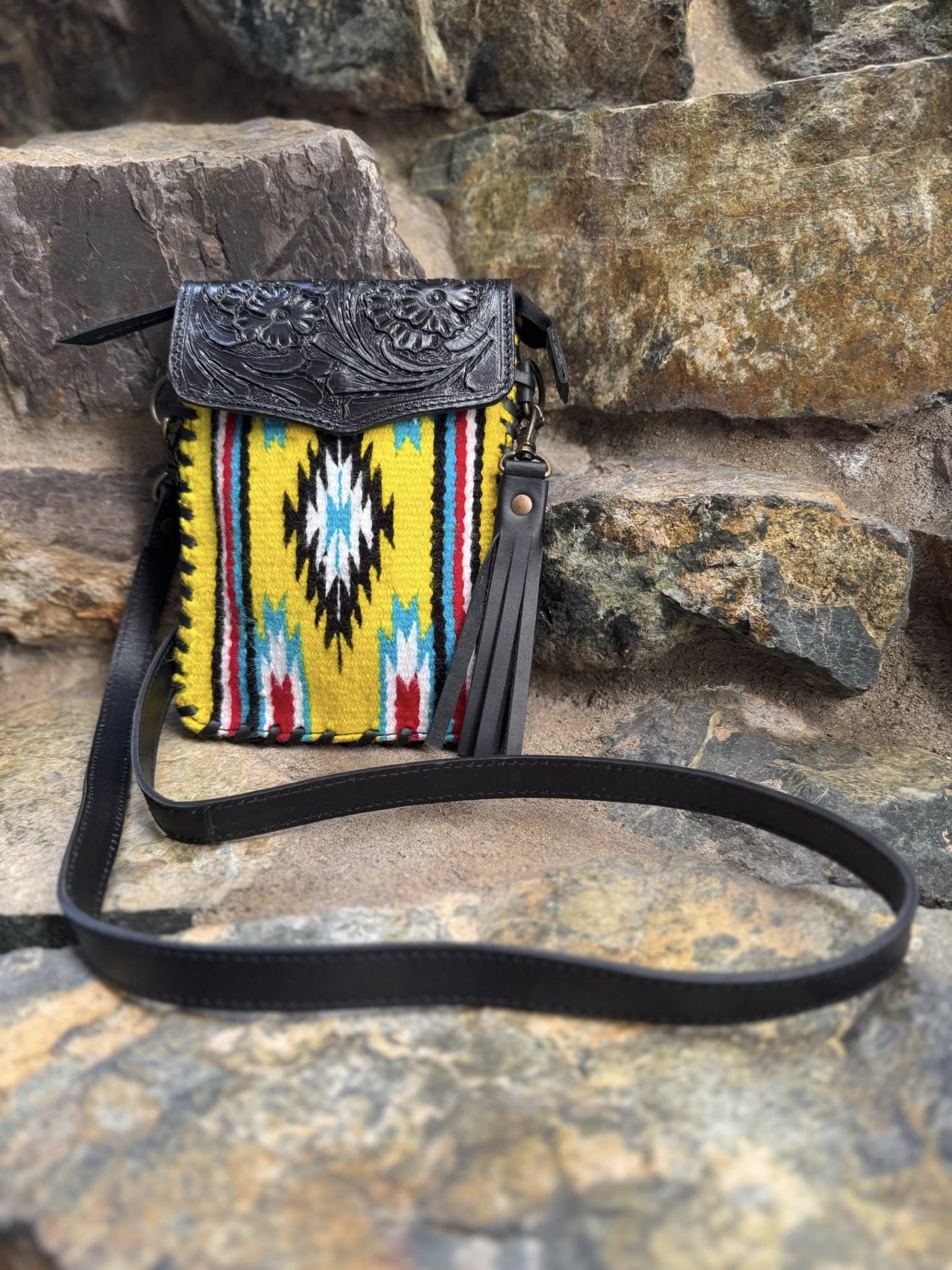 Aztec Saddle Blanket Hand Bag with Tooling Small Black and Yellow
