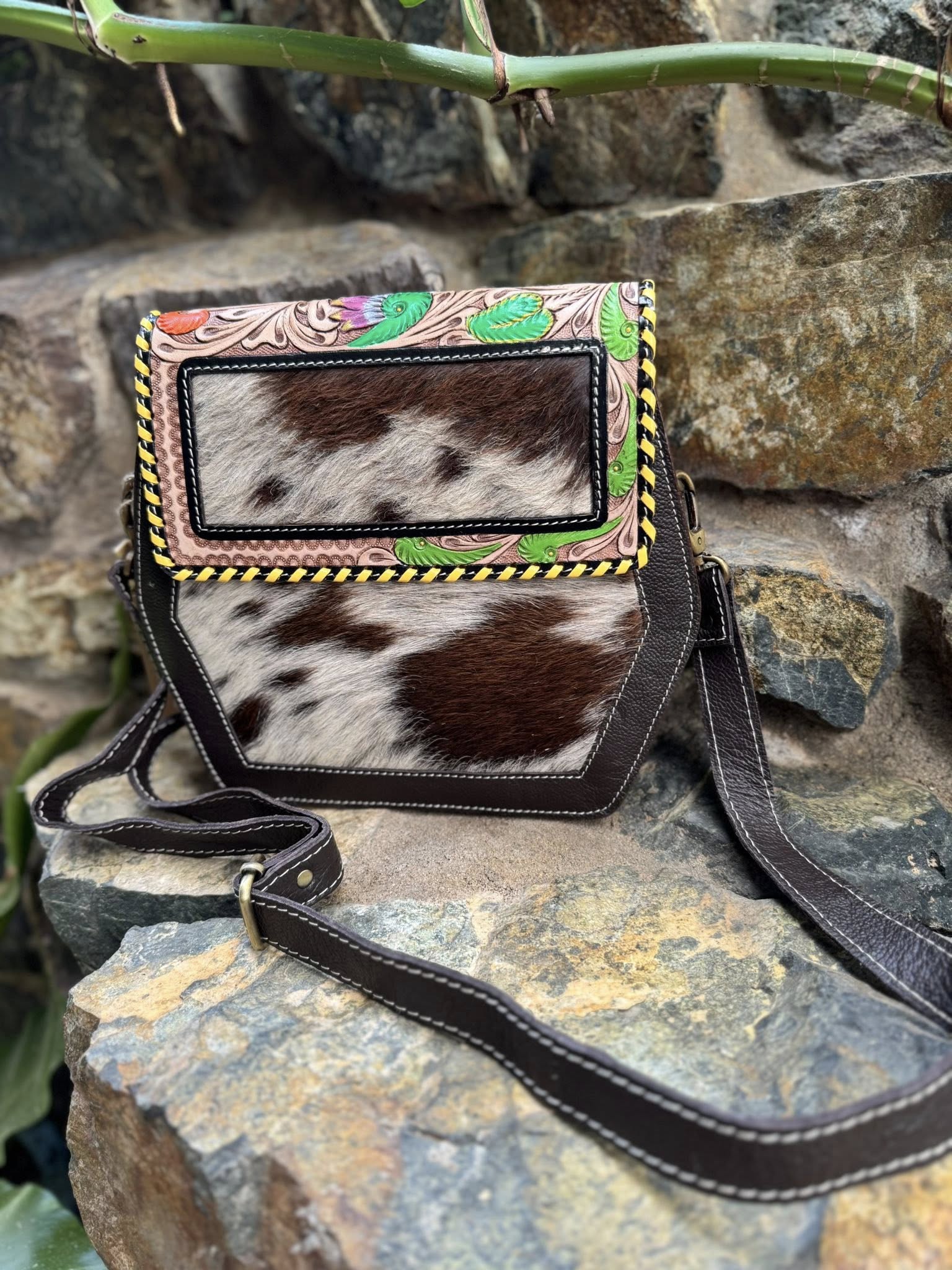 Medium Geometric Cowhide and Tooled Leather Hand Bag